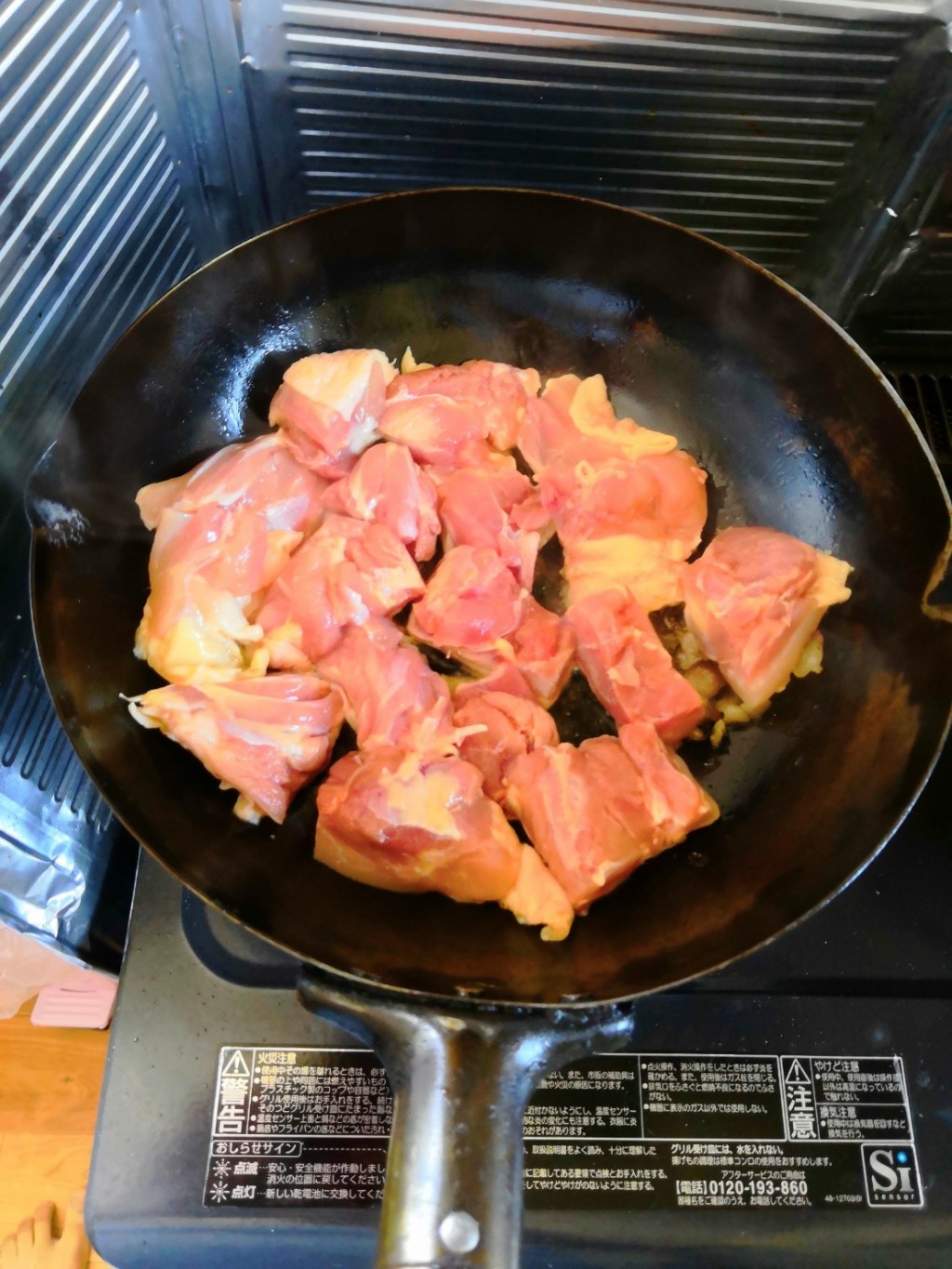 6.鶏肉を中火で焼きます。気長に待って焼き目がつくまでひっくり返さないのがコツです。