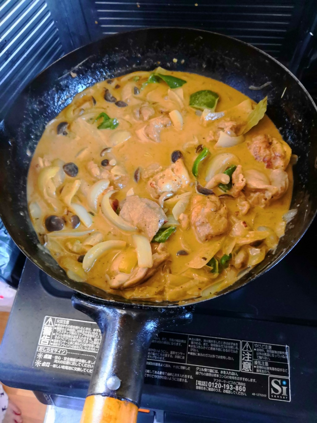 8.全体に火が通ったら、火を弱めココナッツミルクやハーブ類、カレーの壺を大さじ3程入れて5分ほど煮込みます。
